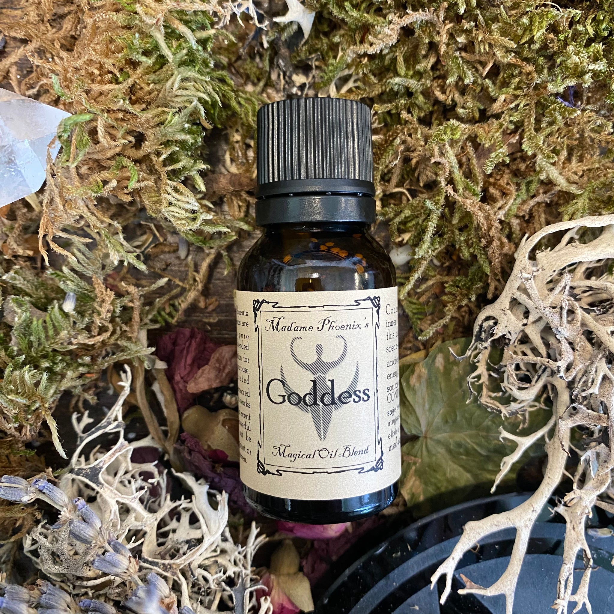 La Grande Déesse est l’ancienne source de toute vie ; l’incarnation des pouvoirs générateurs féminins divins dont toute la nature jaillit. Cette huile, mélangée à des parfums sacrés et infusée d'élixir de pierre de lune, peut être utilisée pour se connecter à cette énergie la plus ancienne et sacrée - lors de rituels ou pour la force et le pouvoir magiques.