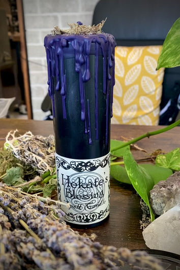 Hekate, the Greek Goddess of women, childbirth, the dead, witchcraft, magic- the gatekeeper, the watcher at the crossroads, the lady of the distant roads- is one of the most ancient and powerful goddesses that is still worshipped today all over the world. Connect with Her powerful energy with this handmade pillar candle- black with darkest purple accents and topped with sacred herbs and an antique key charm-