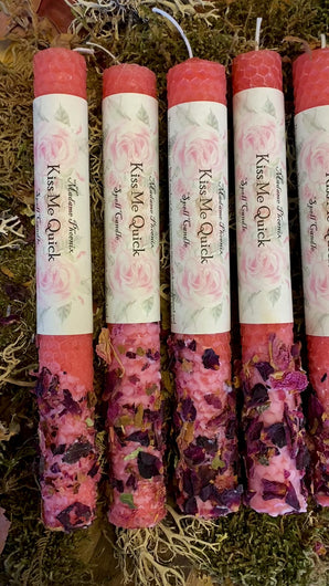 These candles are hand made at the appropriate time- each one dressed and anointed with my Kiss me Quick spell oil; a delicate and irresistible blend of sensual musks and spices to draw the attention that you want! They are then hand dipped and rolled in love herbs. The only Kiss me Quick candle I make!