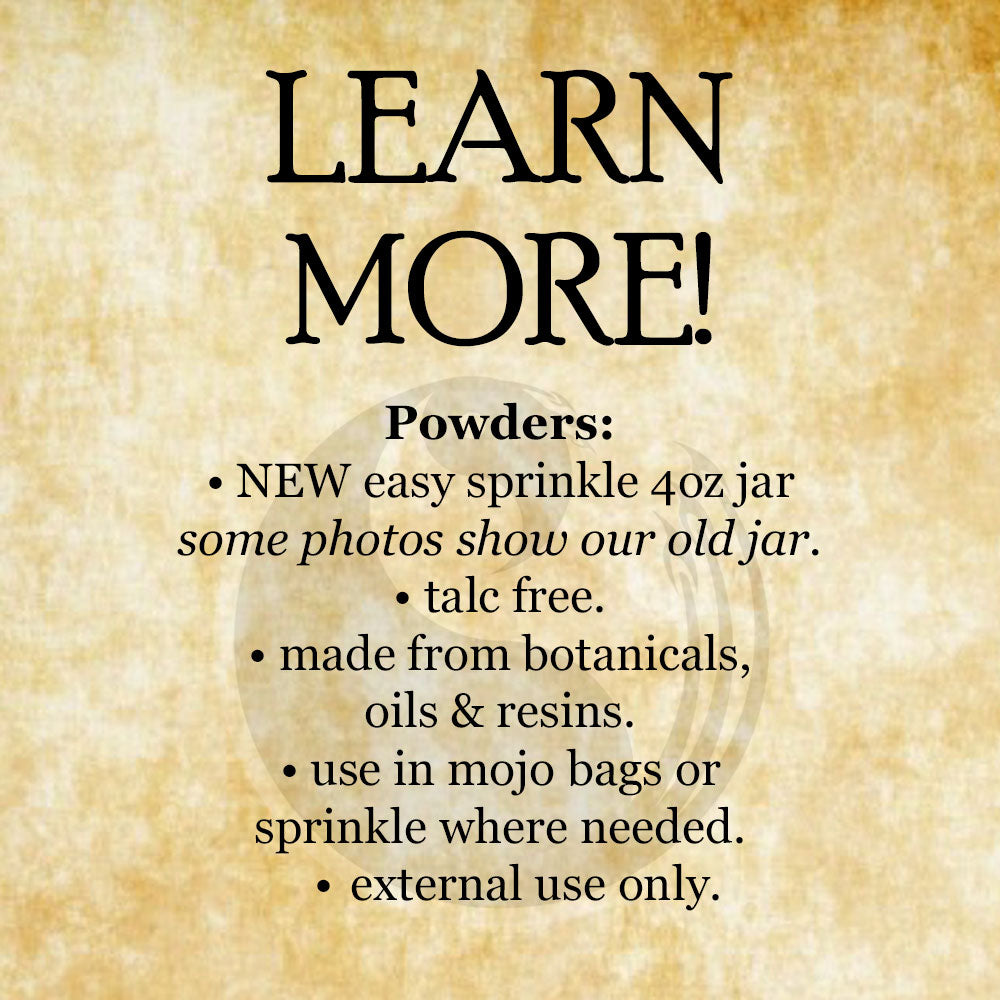 Suitable for wearing as a dusting powder, sprinkling where needed or using on mojo bags and spells.