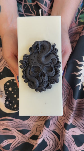 Burn this candle on your Ancestor shrine, during the Fall season or a Samhain ritual. Bold black and white stripes faced with a detailed skull and serpent embossing